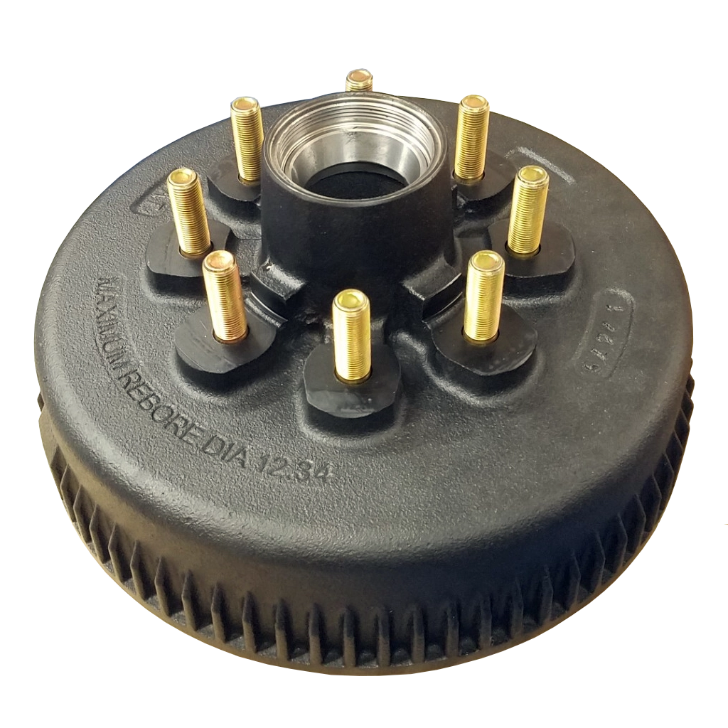 Description:1 (One) 7,200 lb. Trailer hub/drum for brake axle. This is an 8-lug 5/8" Studs on 6.5" spacing. For use with12" x 2-1/2" brakes. Hub comes with races and studs pressed in. This item is available as a bare unit, or as a kit. Please select the correct kit for your needs.