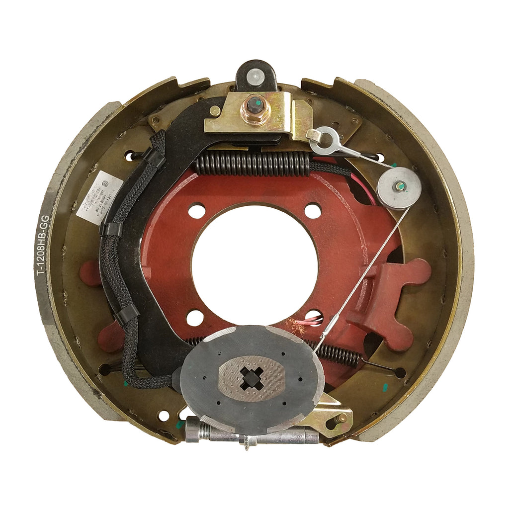 Description: 1 (One) 12.25" x 2.50" Left hand electric self-adjusting brake assembly for 7.2-8,000 lb. axles. Cast trailer backing plate with 4-hole mount pattern.