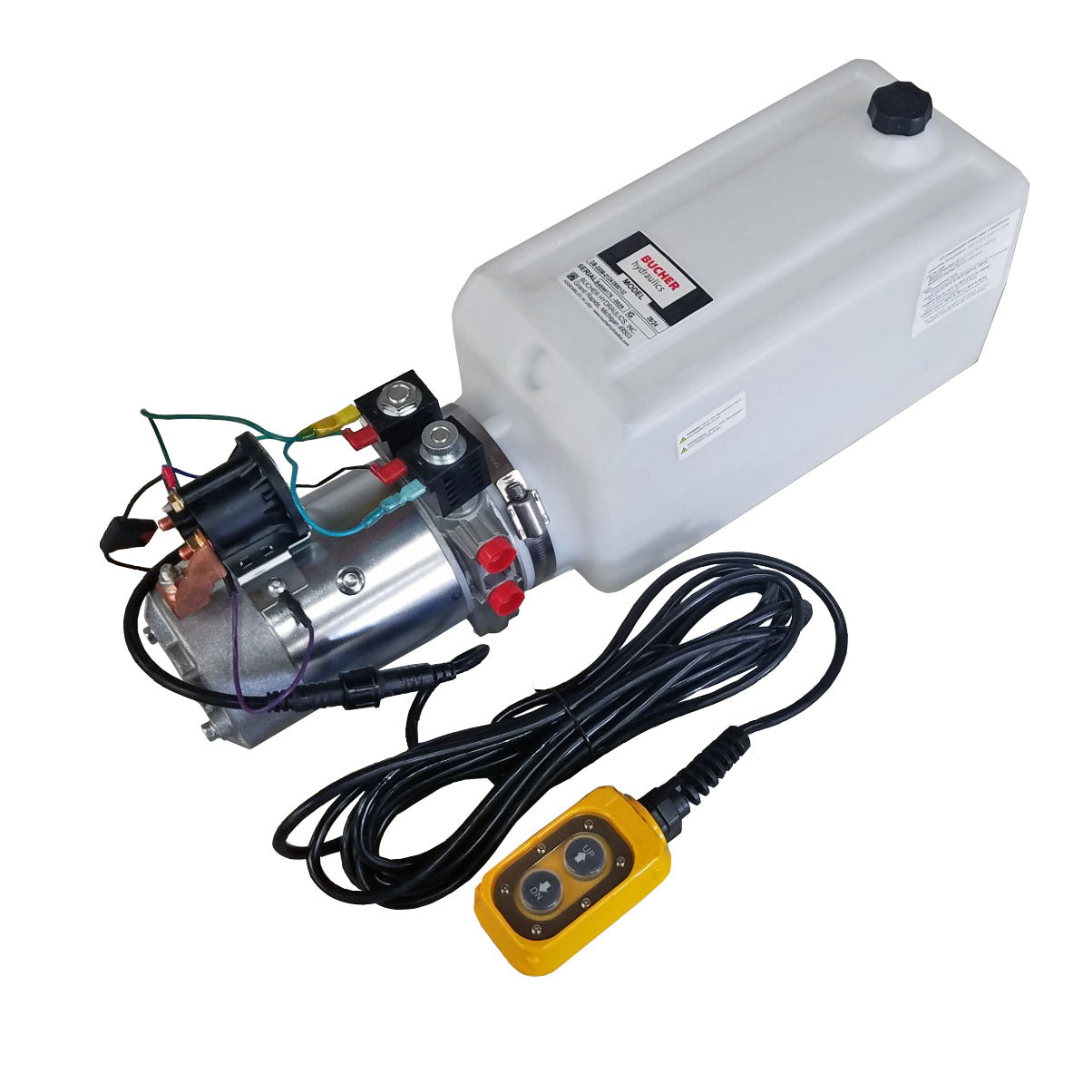 - Description: 1 (One) Bucher (Monarch) hydraulic hoist pump - double acting (power up/power down) horizontal mount. Pump, motor, reservoir, valve, #6 SAE outlet and two button control. Standard pump used on Rugby hoists TB-8, TB-10, TB-12, TB-14, TB-18 and TB-20.