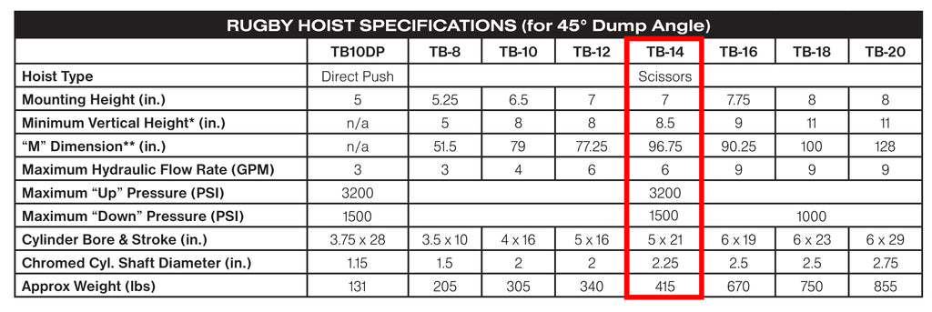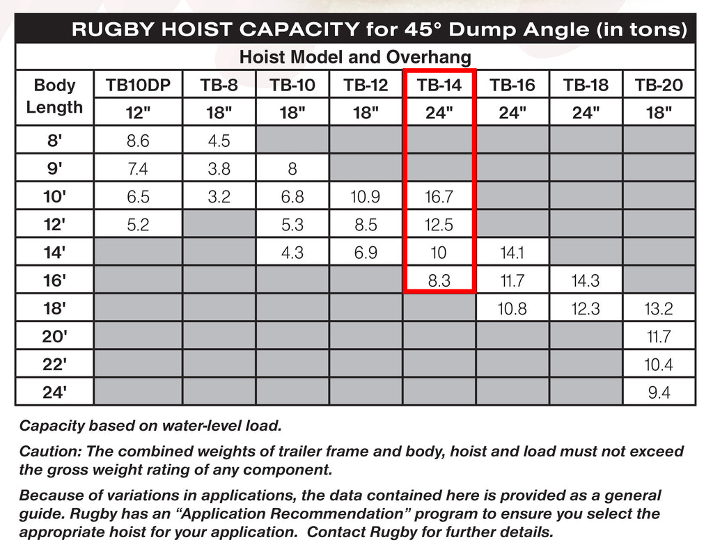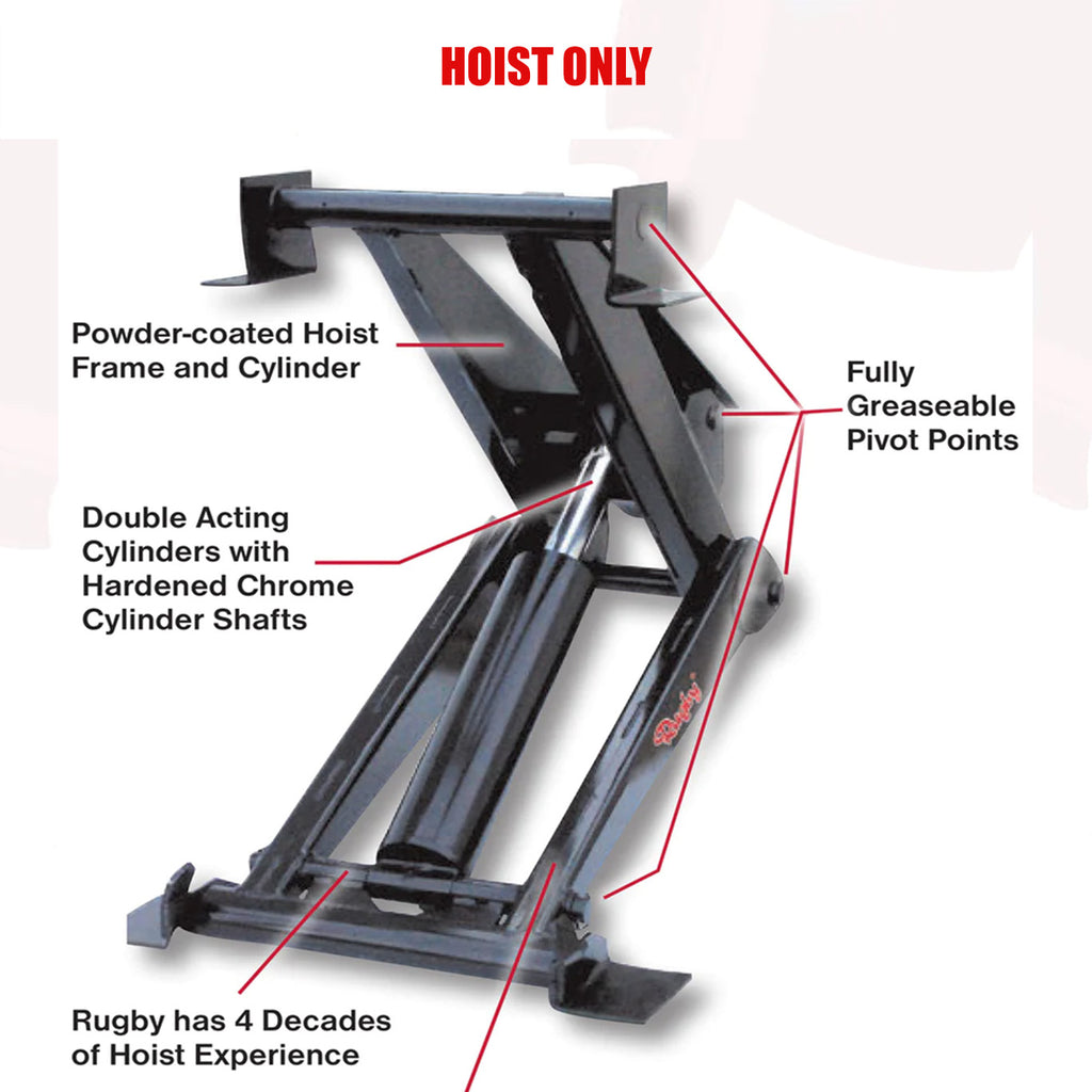 - Description: 1 (One) Rugby TB14 Series trailer hoist. Rugby's hoists are designed from the ground up for trailer applications. TB Series hoists feature fully greaseable pivot points and double-acting cylinders with hardened chrome cylinder shafts, finished in Rugby's rugged work-ready Black Powdercoat. Made Proudly in the USA!
