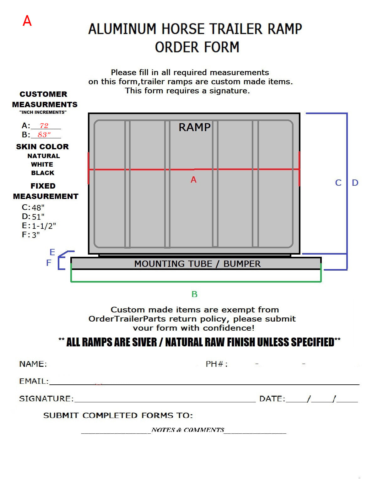 - Size: Our Ramps measure 72" Wide and 48" Tall. The mounting bumper measures 83" Long. We can customize your ramp to your trailer with a few measurements, (see "A & B" in the last photo).