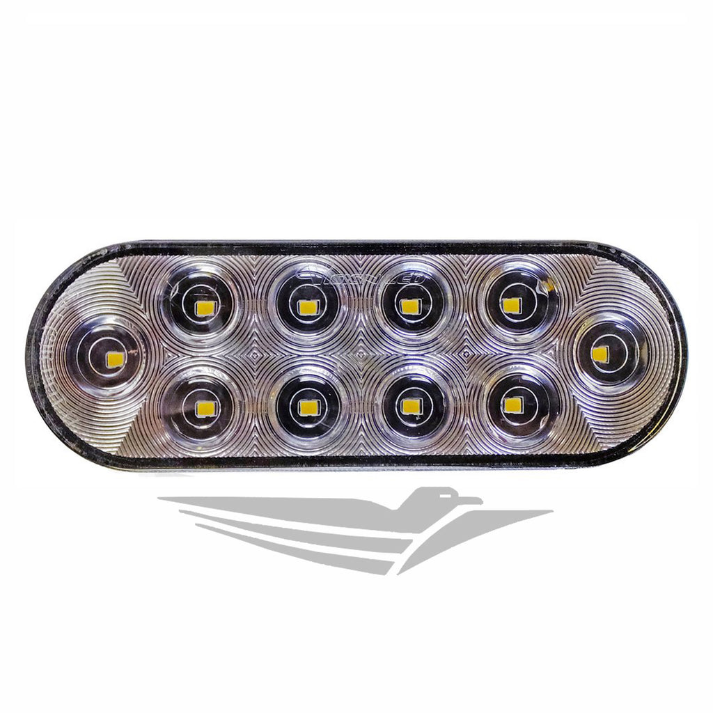 - Description: 1 (One) Sealed 6" Oval LED Clear Backup Light with ten super bright diodes. The polycarbonate lens is sonically welded to the housing to prevent the entrance of water. Universal fit in most 6" oval applications and meets P2 Rating, DOT, SAE, and FMVSS 108 Standards.