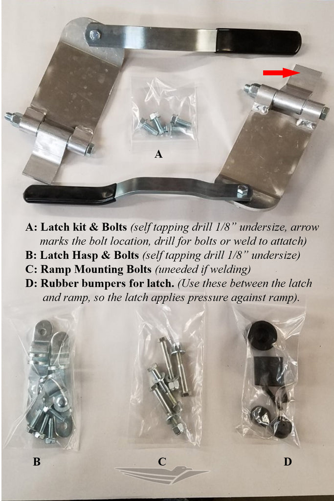 - Description: 1 (One) Aluminum Horse Trailer Ramp with installation latch & hardware kit. This unit is a great add on to your horse trailer! Hand Made in the USA with premium high strength Aluminum. Ramps constructed of welded frame tubing, secured to an aluminum sheet squeezed between heavy duty plywood. The top of the ramp is finished off with textured rubber conveyor belt matting, for a great anti slip surface. Furnished with latch hardware, and ramp springs installed.