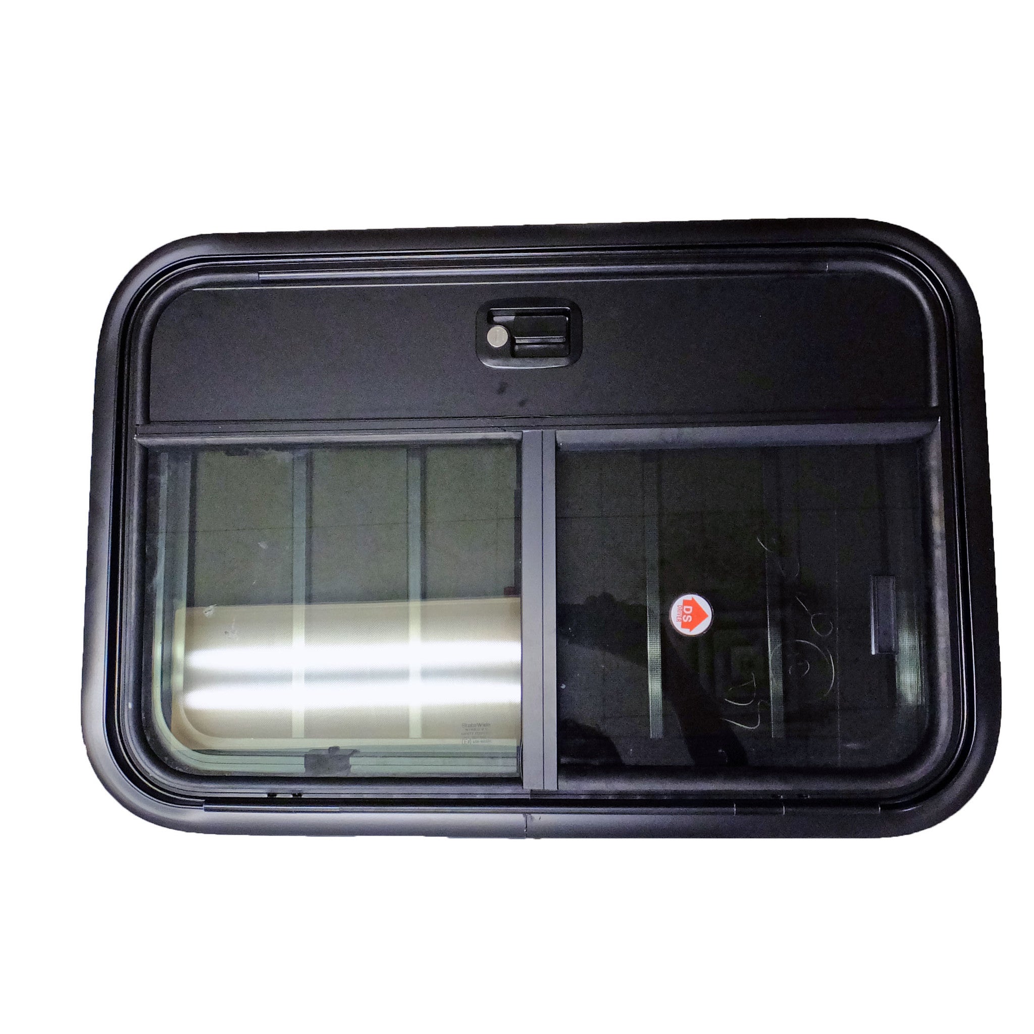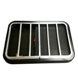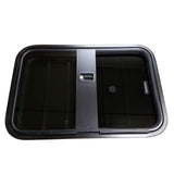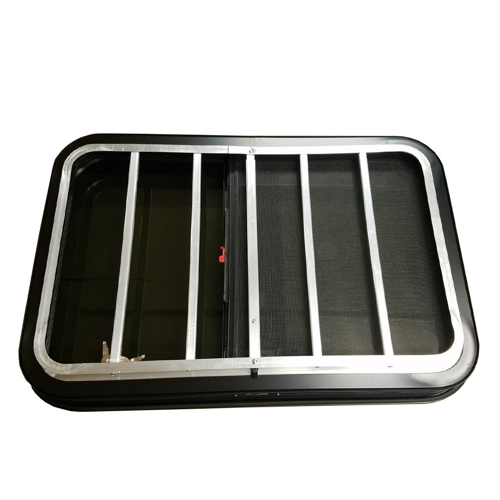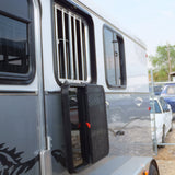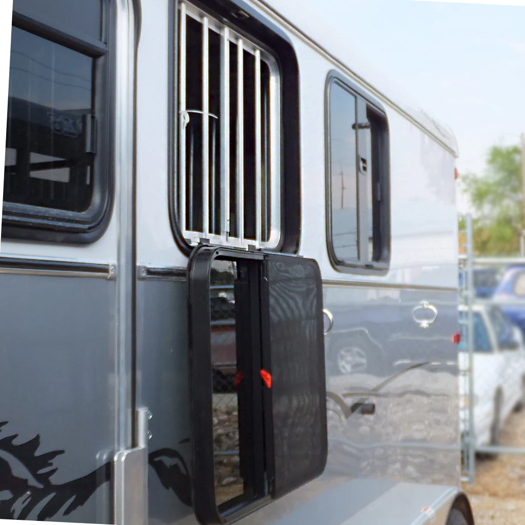Description: 1 (One) 30"x20" Drop down feed window with aluminum bars. Window is multi-functional featuring a screened slider panel for ventilation or drop down function for feed access. Also comes with aluminum jail bars for safety that can also be dropped down for access. Glass is smoke tinted safety glass for maximum protection and comfort. This window features a mid mount lockable latch for easier access. Includes 1 key.