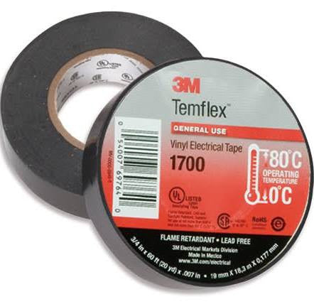 • Description: 1 (One) Roll 3/4" X 60' (20 yd) X .007" 3M Temflex Vinyl Insulating Electrical Tape.  Suitable for use at not more than 600V and not more than 80C (176F). Flame Retardant / Lead Free / Cold & Sunlight Resistant