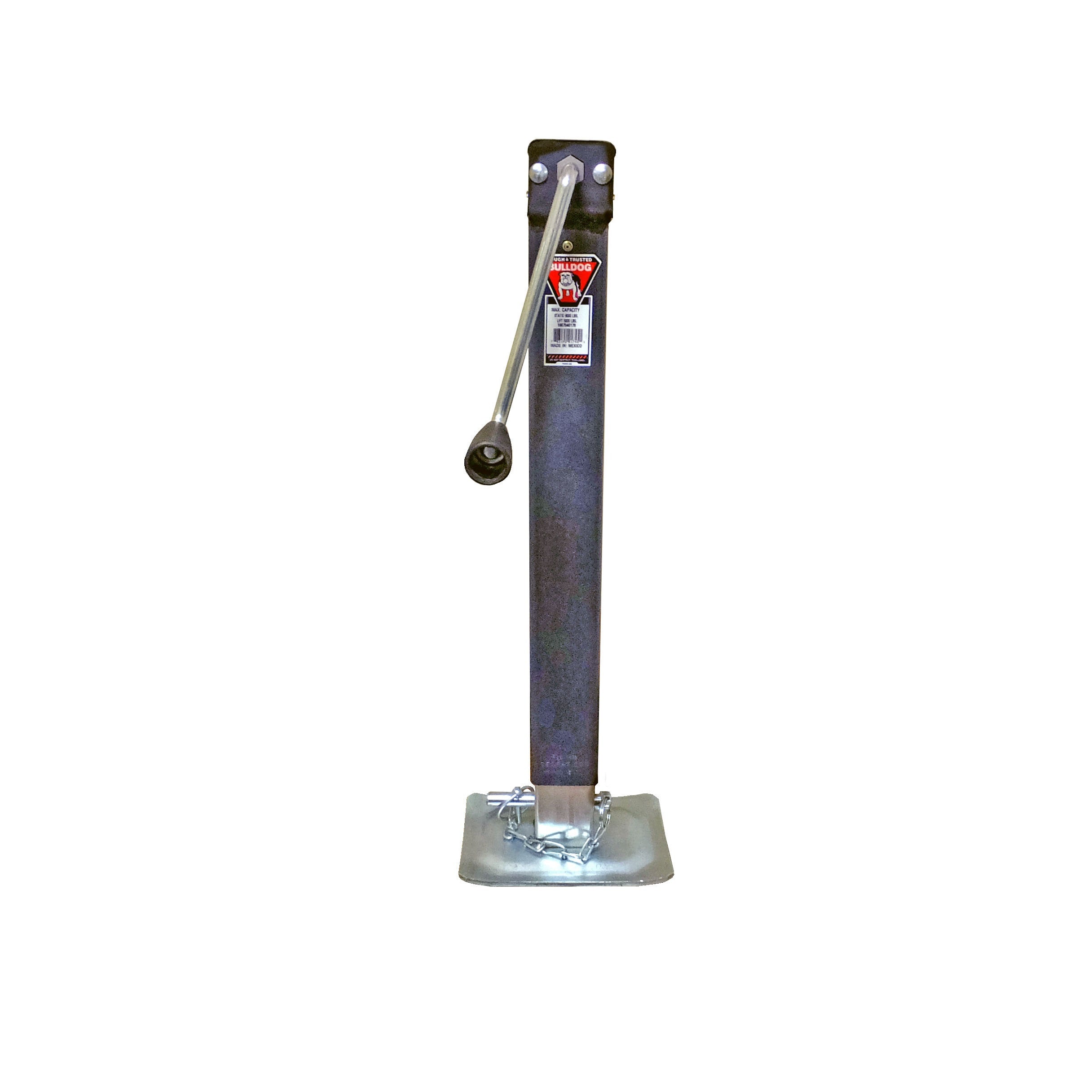 • Description: 1 (One) 8K Bulldog square jack with side wind and drop leg. This jack can be adjusted to multiple positions. Includes heavy-duty pull pin/chain assembly and drop leg with large 6” x 8” footplate completed with a zinc finish.