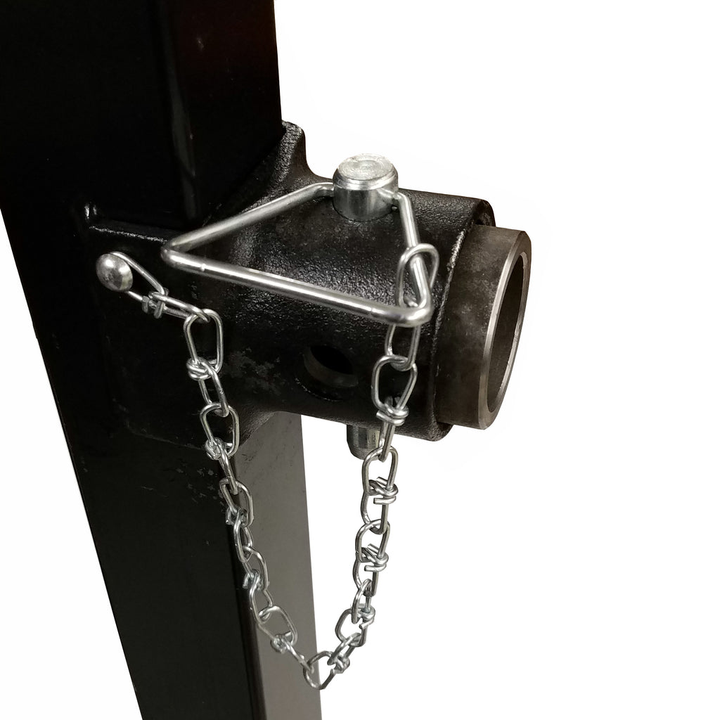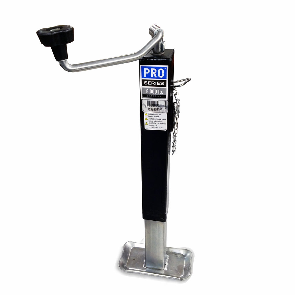 • Description: 1 (One) Pro Series 8K Top wind square jack with a fixed foot and swivel mount. Heavy duty 2-1/4” square outer tube with black paint finish. Includes heavy-duty swivel mount with pull pin/chain assembly. Black claw grip handle, with clear zinc arm that can be folded away when not in use.