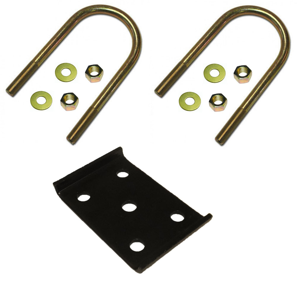 1 (One) Upgraded U-bolt kit for mounting a 2" wide spring on a 5,200 lb. to 7,000 lb., 3" round trailer axle. U-bolts and nuts are yellow zinc plated. Tie plate is powder coated black.
